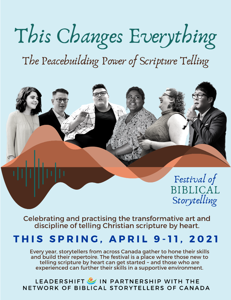 Join Dr Tom Boomershine, acclaimed speaker, author and founder of the Biblical Storytelling Movement, and other workshop leaders from across Canada for theme presentations, worship & praise, workshops for newcomers, workshops for experienced tellers, and the Epic Telling of Mark (this is sooooooooo cool). LeaderShift is thrilled to be sponsoring this event with the Network of Biblical Storytellers Canada.The cost is $50 per person (or $30 if you register before March 15). A group rate of $25/ person when coming with 5 or more is available across the registration window (no date restrictions).