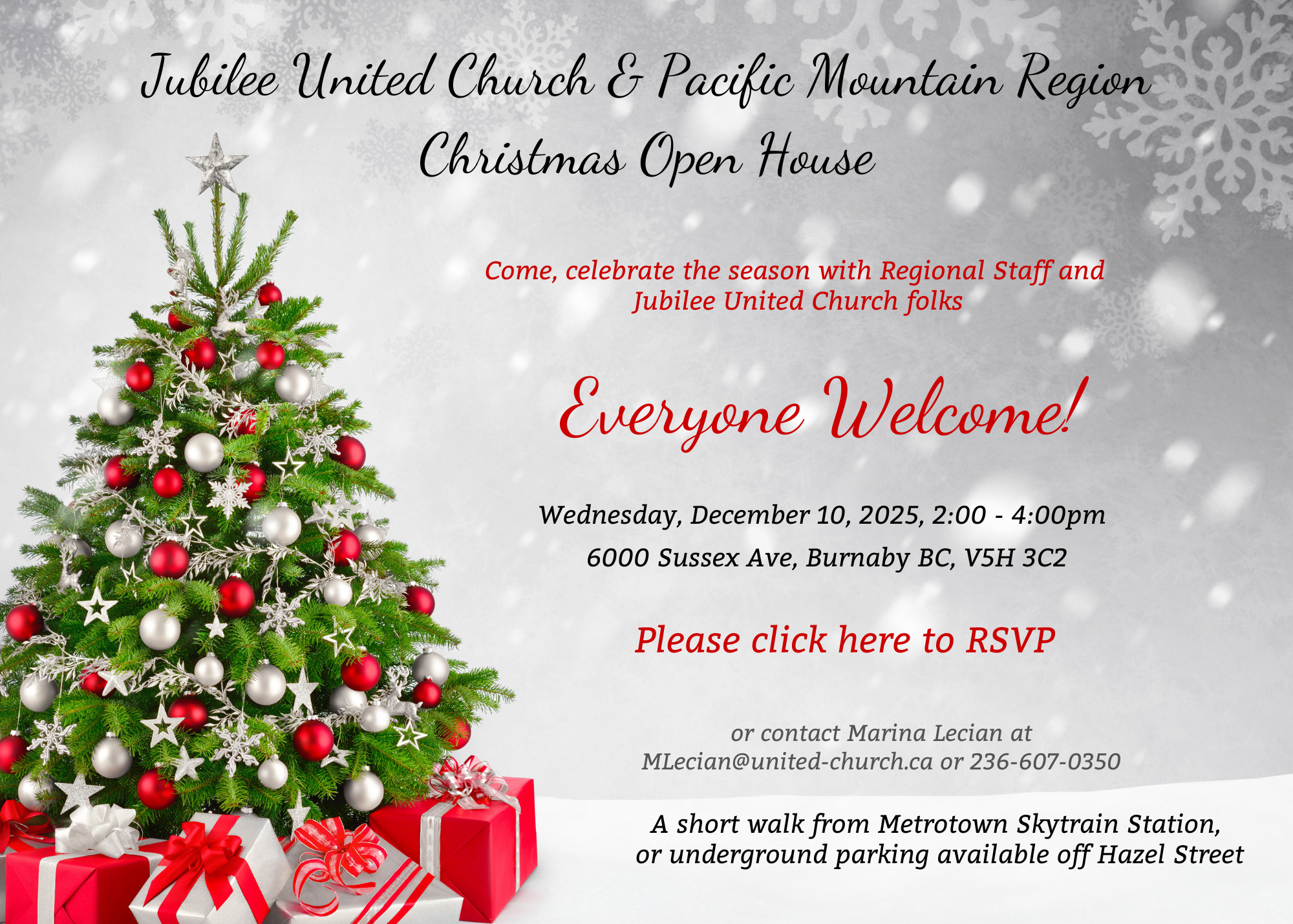 A Pacific Mountain Regional Council & Jubilee United Church Offering Christmas Open House Wednesday December 10, 2025 In-Person at 6000 Sussex Ave., Burnaby BC Come […]