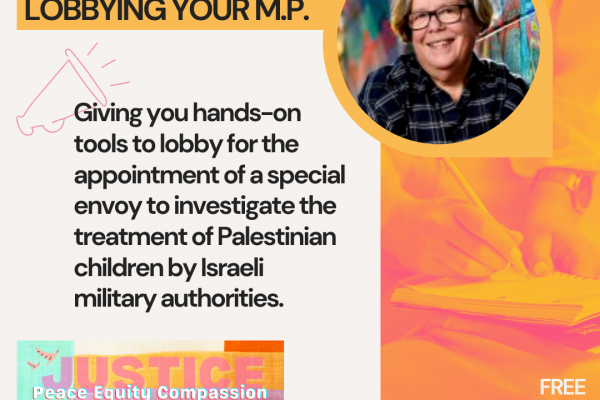 This FREE online workshop with Libby Davies will give you hands-on tools for lobbying your federal Member of Parliament, to advocate for a Special Envoy appointment to Israel.