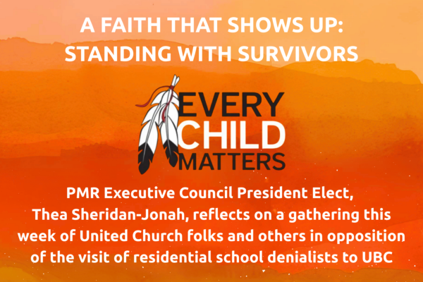 I have a file folder that I carry with me to every United Church meeting. In it are some of the following: a well-travelled copy of the Truth and Reconciliation Commission of Canada: Calls to Action from the center in Winnipeg, a blue copy of the 1996 Apology and 1988 Response which I received at GC43, my notes from a Four Directions decision making training workshop, and a heavily annotated copy of the requirements to become an Affirming Church from 2016. We have made a plethora of commitments in words and in covenant. Our world and our church are hurting, and we have a responsibility to show up in the ways that Jesus calls us to. I am proud to carry our commitments in words in a file folder, but more importantly, I am called to stand alongside this community, with PMRC staff, ministers and congregation members to physically show up in solidarity.